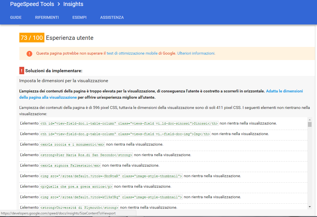 Ho alcune views sul sito. Faccio un test con Google per l'ottimizzazione sui dispositivi mobili e, con mia viva sorpresa, scopro che "Questa pagina potrebbe non superare il test di ottimizzazione mobile di Google" come potete vedere nella immagine 2.